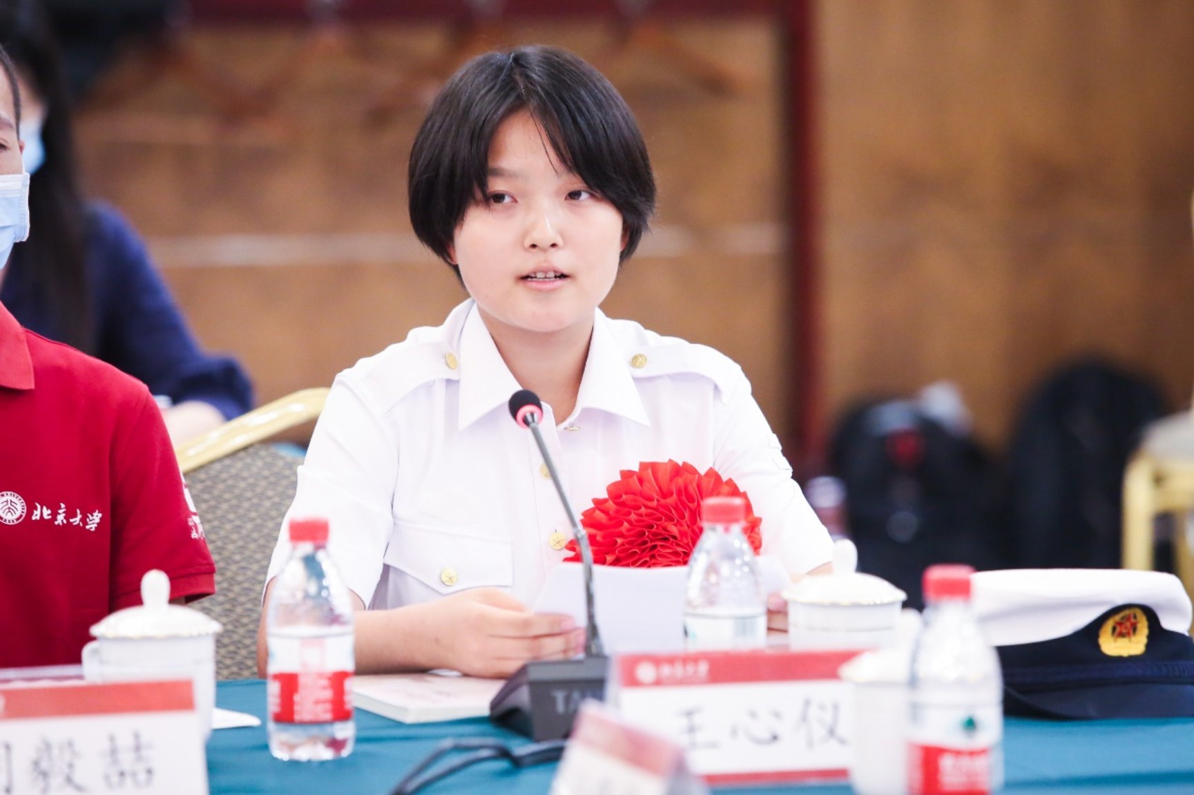 中国语言文学系2018级本科生王心仪代表刚刚退役返校的老兵发言,她讲述了自己在辽宁舰光环与荣耀背后的默默坚守,也分享了执行重大任务时的使命感和自豪感。两年的军旅生活让她从稚嫩走向成熟,在火热的军营中,她感受到了属于军人的热血与坚定,以及这份坚定给予的信仰与力量。王心仪对服役期间学校领导、老师的关怀表示感谢,并激励即将踏入军营的新兵同志们不负韶华,砥砺前行,用自己的脚步丈量青春的无限可能。